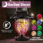 Enhance your outdoor space with this Solar Hummingbird Feeder. Featuring a 32 fl.oz capacity, hand-blown glass, and a leak-proof design, it offers both beauty and functionality. The color-changing solar lights create a magical ambiance while attracting hummingbirds, day or night.