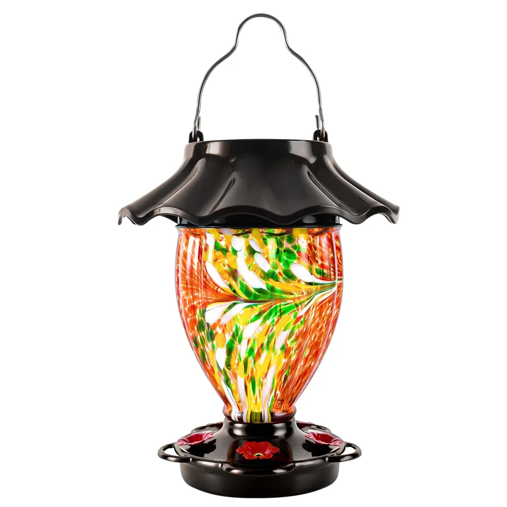 • LEAK PROOF & SEE THROUGH : This vintage glass feeder features a convenient 32 fluid ounces capacity, a slender shape and a completely sealed base that has the least drips and spills. Easy viewing of the nectar level through the colorful yet translucent glass reservoir.